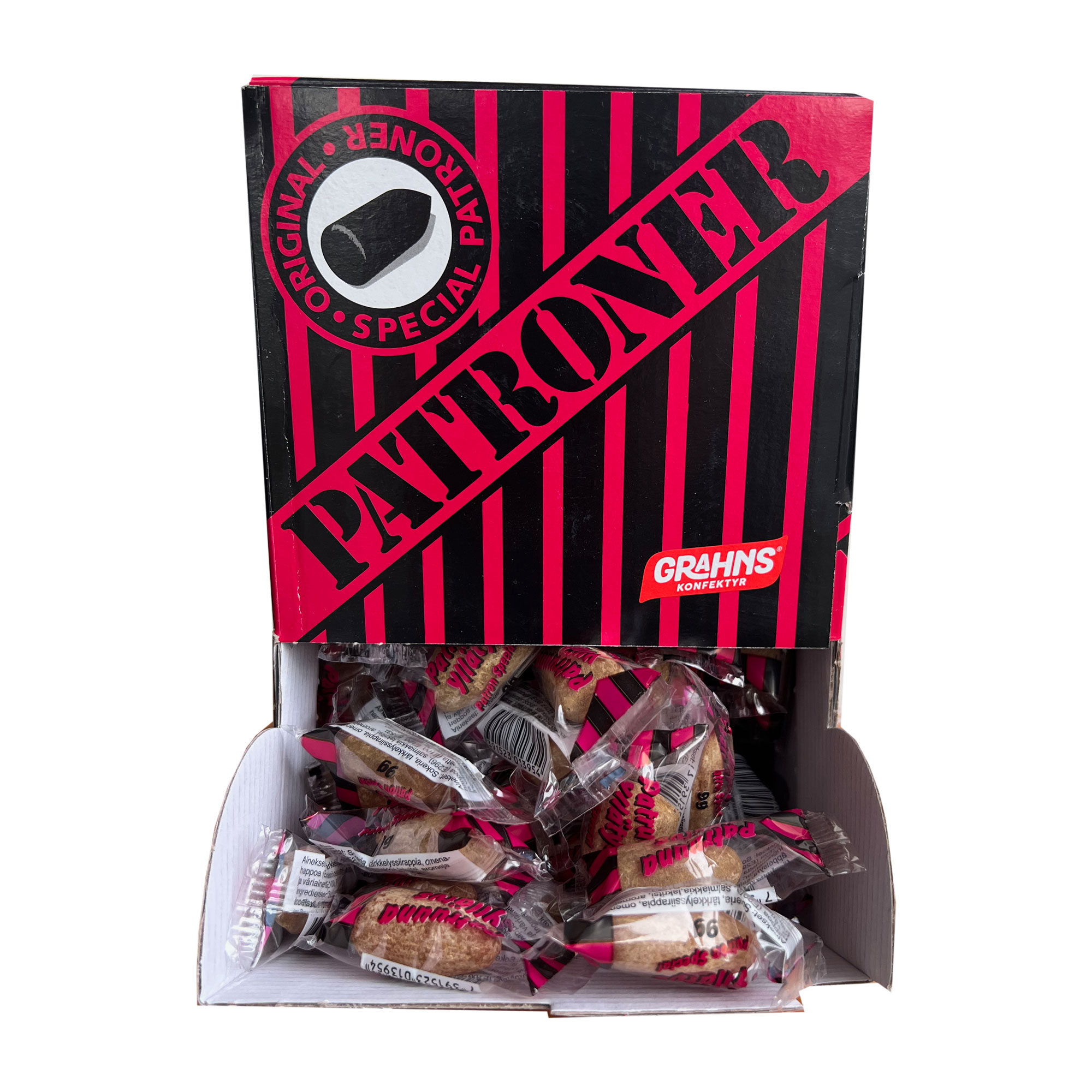 Patruuna Yllätys sisältää noin 210 kpl kovaa salmiakkimakeista. Sopii hyvin julhakarkeiksi tai nautittaviksi ihan kotioloissakin.