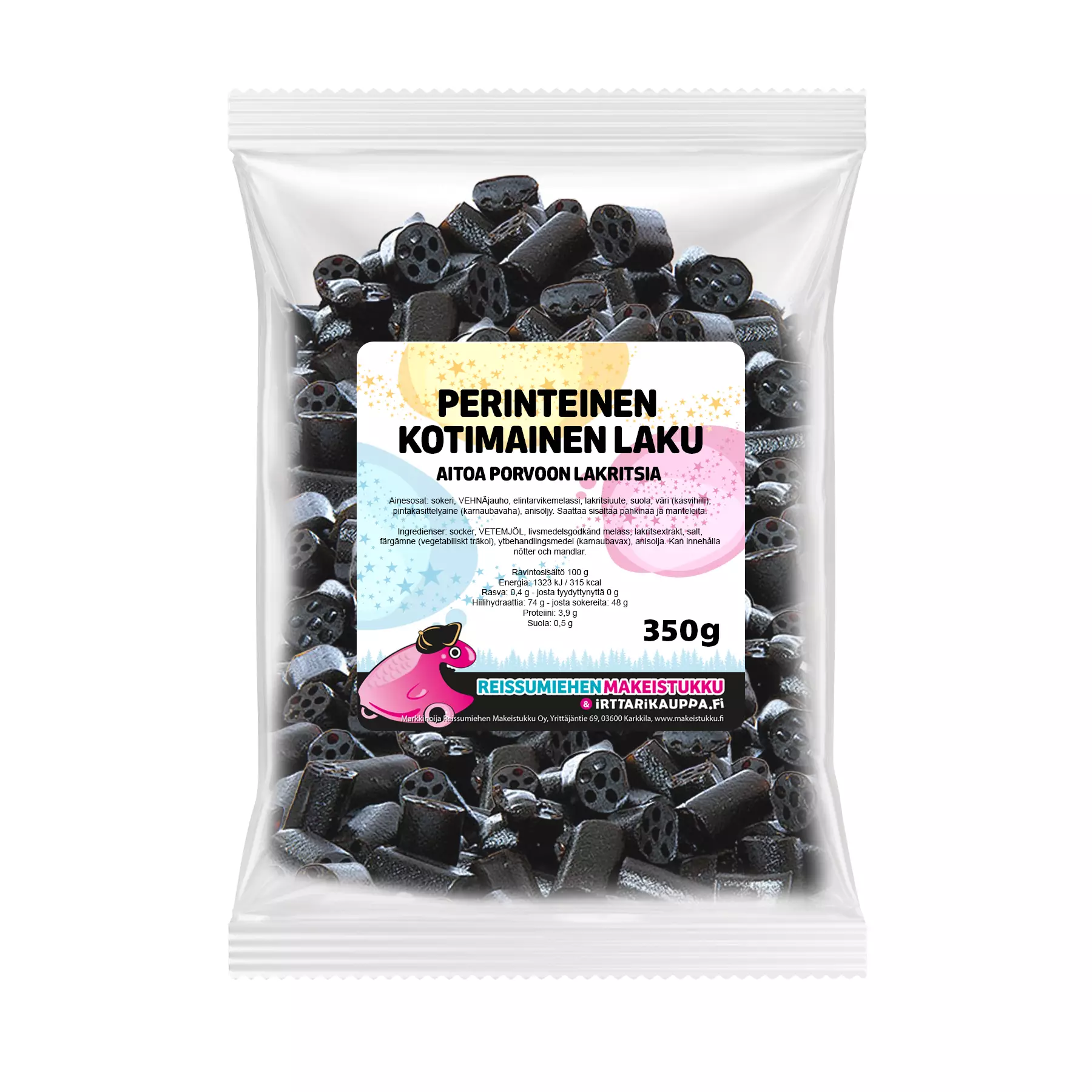 Ainesosat: sokeri, VEHNÄjauho, elintarvikemelassi, lakritsiuute, suola, väri (kasvihiili), pintakäsittelyaine (karnaubavaha), anisöljy. Saattaa sisältää pähkinää ja manteleita. Tarkista tuoteseloste aina myös pakkauksesta.