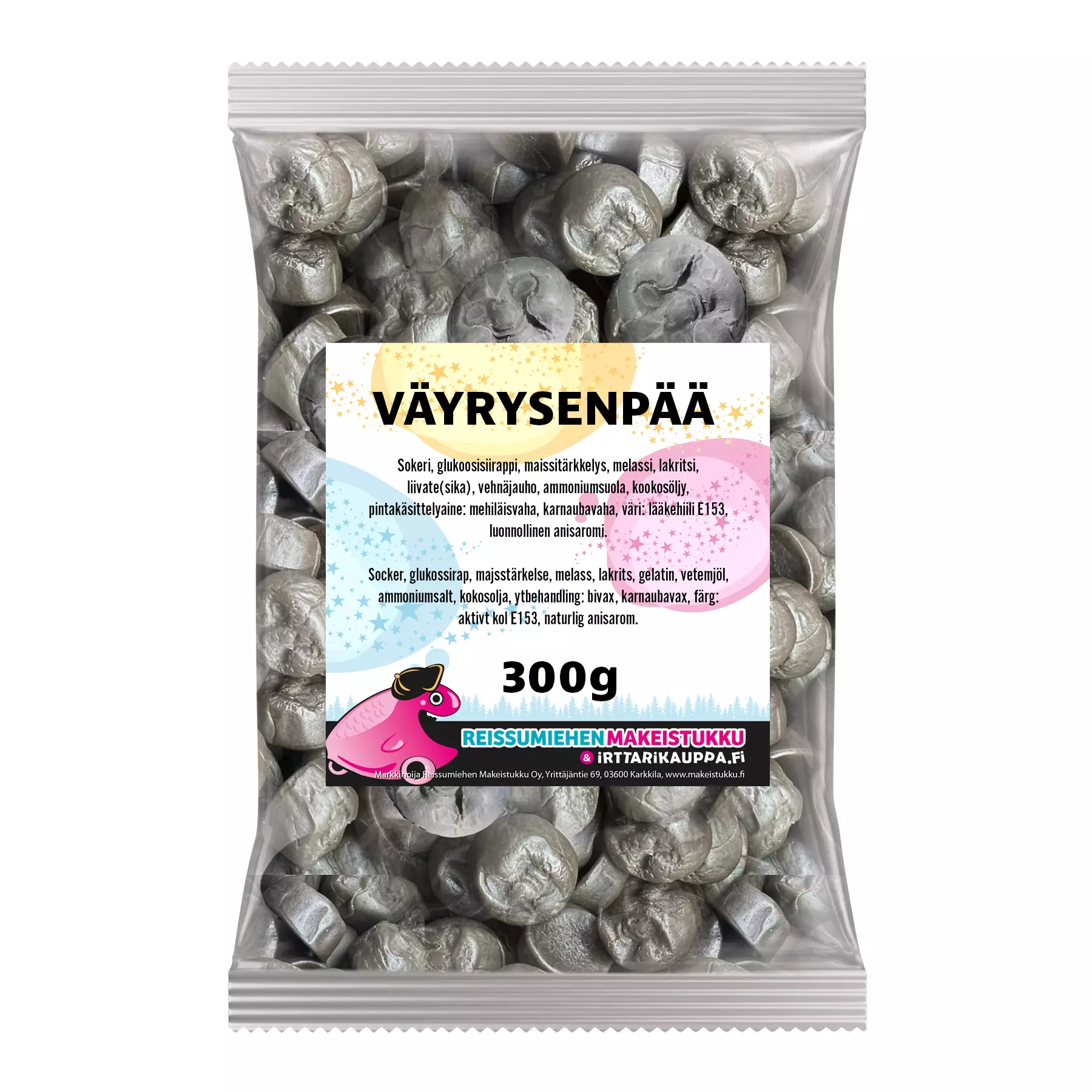 Sokeri, glukoosisiirappi, muunnettu maissitärkkelys, melassi, liivate, vehnäjauho, lakritsiuute, ammoniumsuola, pintakäsittelyaineet: kasviöljy, mehiläisvaha, karnaubavaha, värit: E153, aromit. Sisältää gluteenia ja sulffiittia.